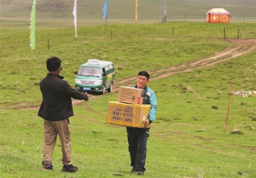 看到郵車來了,牧民迫不及待地迎上去接過自己網(wǎng)購的商品?!酢豆と巳請?bào)》記者 王偉偉 攝