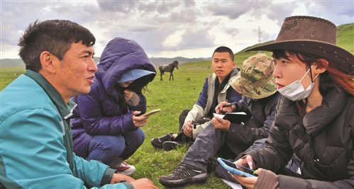 投遞間隙,哈弄奪機(jī)在草原上席地而坐,接受記者聯(lián)訪?!踔袊]政報(bào)記者 張晨昱 攝
