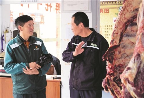 哈弄奪機(jī)向牦牛肉商戶了解最新的市場行情?!跣氯A社記者 李賀 攝