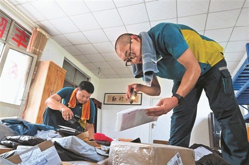 郵件到投遞點后,許桂明和同事抓緊時間登記分揀。