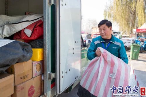 郭海玉正在將包裹搬上郵政車。中國雄安官網高盟 攝