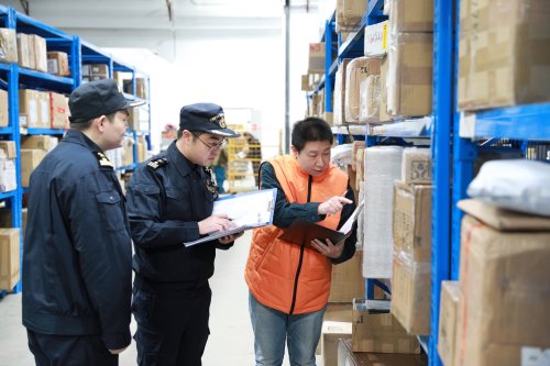 天津郵局海關關員在國際郵件監管場地進行巡檢(央廣網發 天津郵局海關供圖)