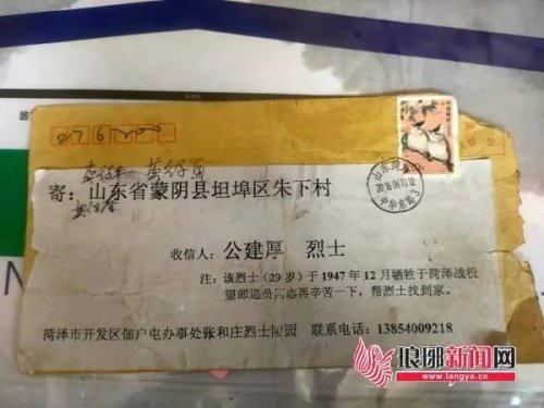 那是2016年6月13日,王德建在對照清單進行勾挑核對信件時,發(fā)現(xiàn)了一封特別的信件。信封上印著“尋找烈士”四個鮮紅大字,寄信人是一位幫助烈士尋親的志愿者——菏澤市經(jīng)濟開發(fā)區(qū)佃戶屯街道辦事處張和莊社區(qū)黨支部書記張景憲,收件地址是“蒙陰縣坦埠區(qū)朱下村”,收件人是“公建厚烈士”,下邊還標注著一行小字:該烈士(29歲)于1947年12月犧牲于菏澤戰(zhàn)役,望郵遞員同志再辛苦一下,幫烈士找到家。