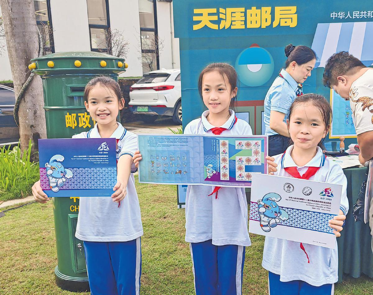 該紀(jì)念郵折巧妙提取了民運(yùn)會(huì)比賽場(chǎng)館——三亞體育中心體育館外立面的白鷺海浪圖形,這既是海南自然風(fēng)光的縮影,也寓意著各民族運(yùn)動(dòng)員如同展翅高飛的白鷺,在賽場(chǎng)上展現(xiàn)出堅(jiān)韌不拔、勇往直前的精神風(fēng)貌。郵折中的個(gè)性化郵票主圖選用“中國(guó)結(jié)”這一傳統(tǒng)元素,附圖則是民運(yùn)會(huì)會(huì)徽,與數(shù)字“12”巧妙結(jié)合,寓意這一國(guó)內(nèi)體育盛會(huì)的傳承與發(fā)展。