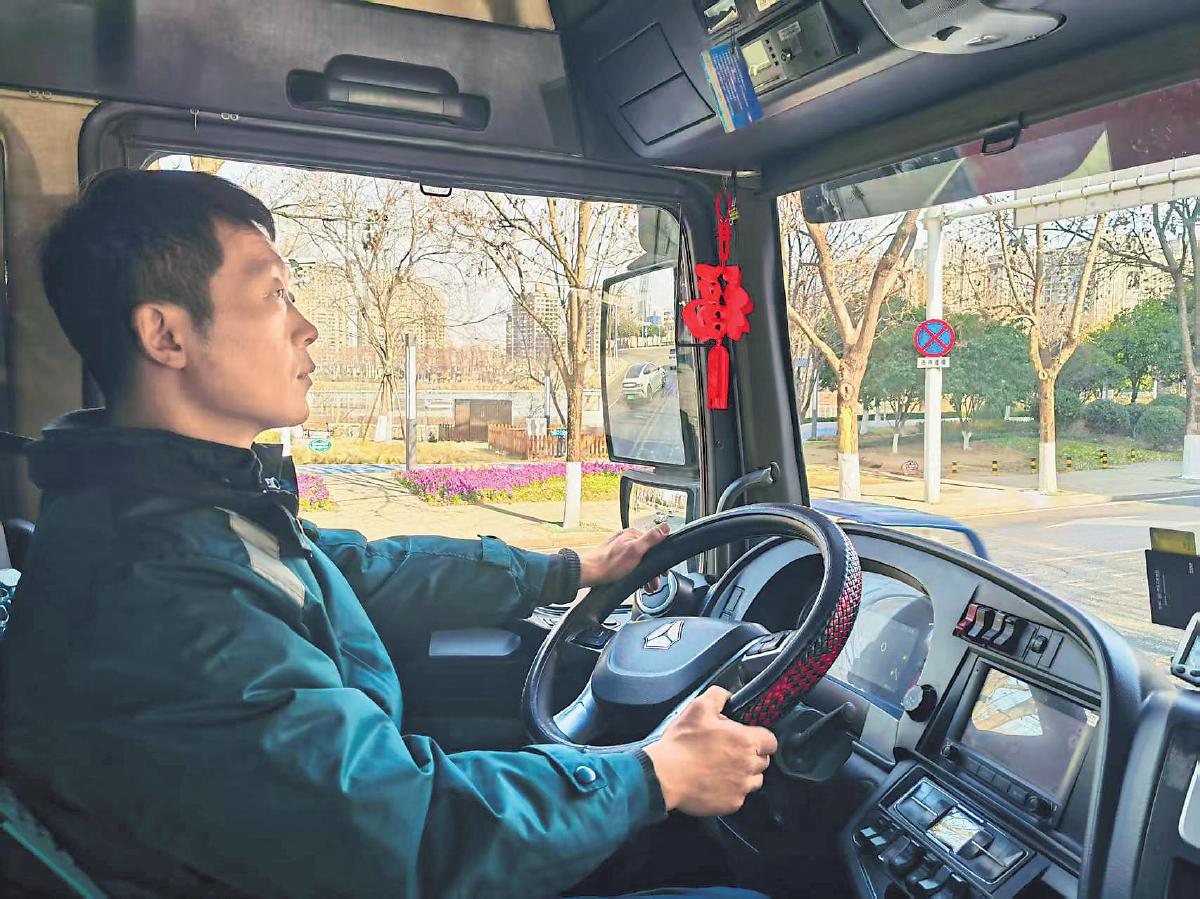 在忙碌中,陳文海會不時掃視一眼掛在駕駛室左側的“平安?!保@是家人送給他的?!捌桨哺!睅砹四晡?,也寄托著他70多歲的父母、勤勞持家的妻子、就讀高三的女兒的牽掛,提醒著他注意安全和保重身體。
