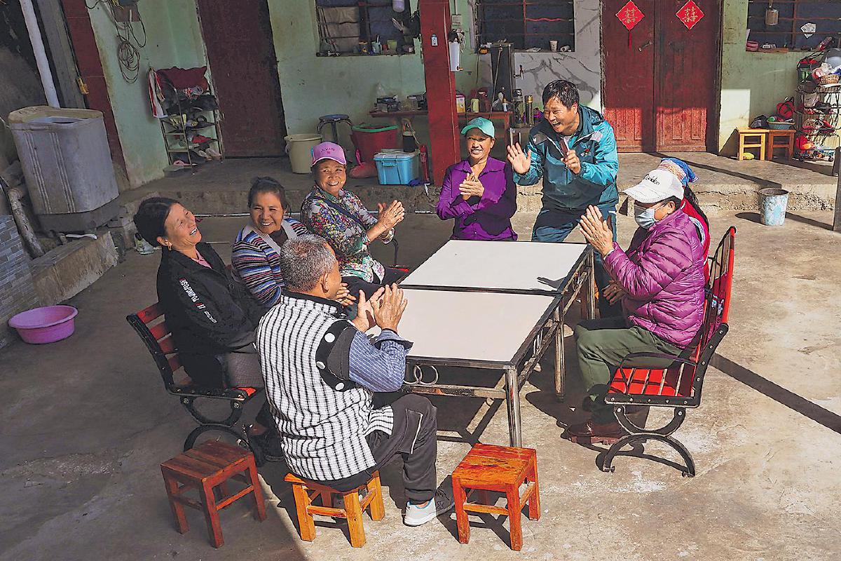 工作之余,桑南才將村民聚在一起,為他們繪聲繪色地講解黨的政策和郵政助農惠農的措施。 □《工人日報》記者 吳凡 攝