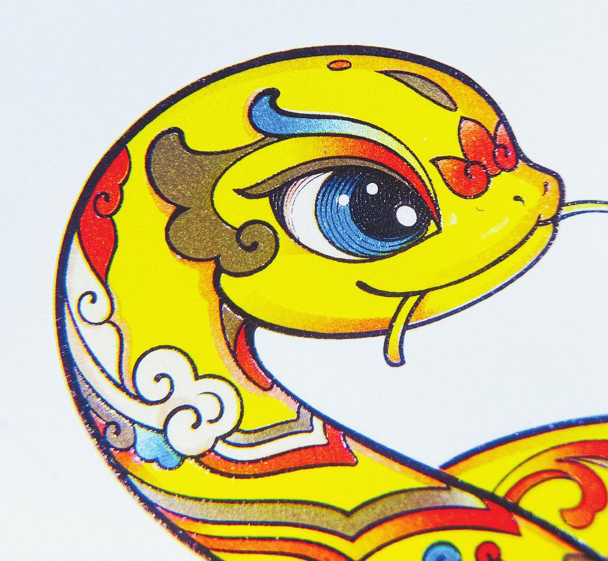 優秀的印制質量離不開優秀的原材料。在此次生肖郵票的印制中,北京郵票廠首次使用了新研發的觸感雕刻油墨。雕刻油墨顏色更深更亮,觸感更明顯。用放大鏡觀察《乙巳年》特種郵票中的雕刻線條,可以看到繪畫筆觸似的刀鋒,用手指在紙上輕輕撫摸時,圖像輪廓有明顯的凸起感。