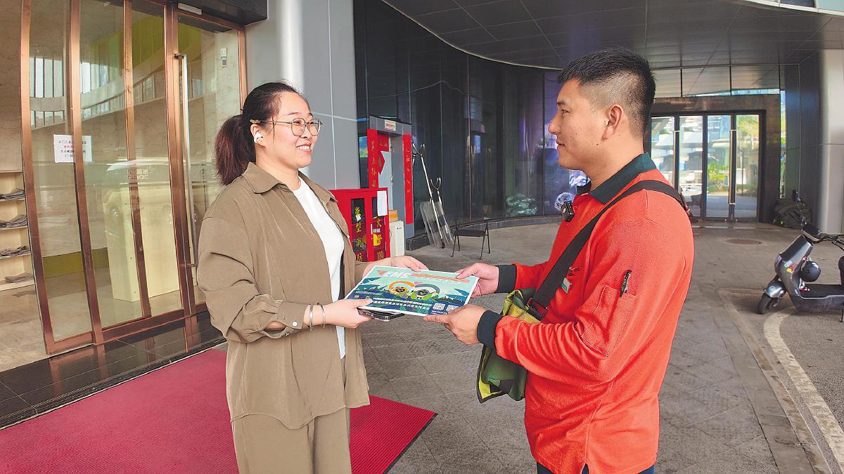 圖為投遞員將消博會(huì)證件郵件送交海口客戶(hù)馬女士。