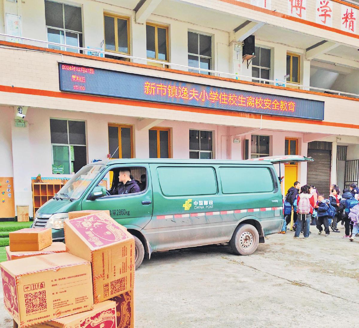 2024年末,郵車為宜賓市屏山縣新市鎮(zhèn)逸夫小學(xué)學(xué)生送去愛心包裹。