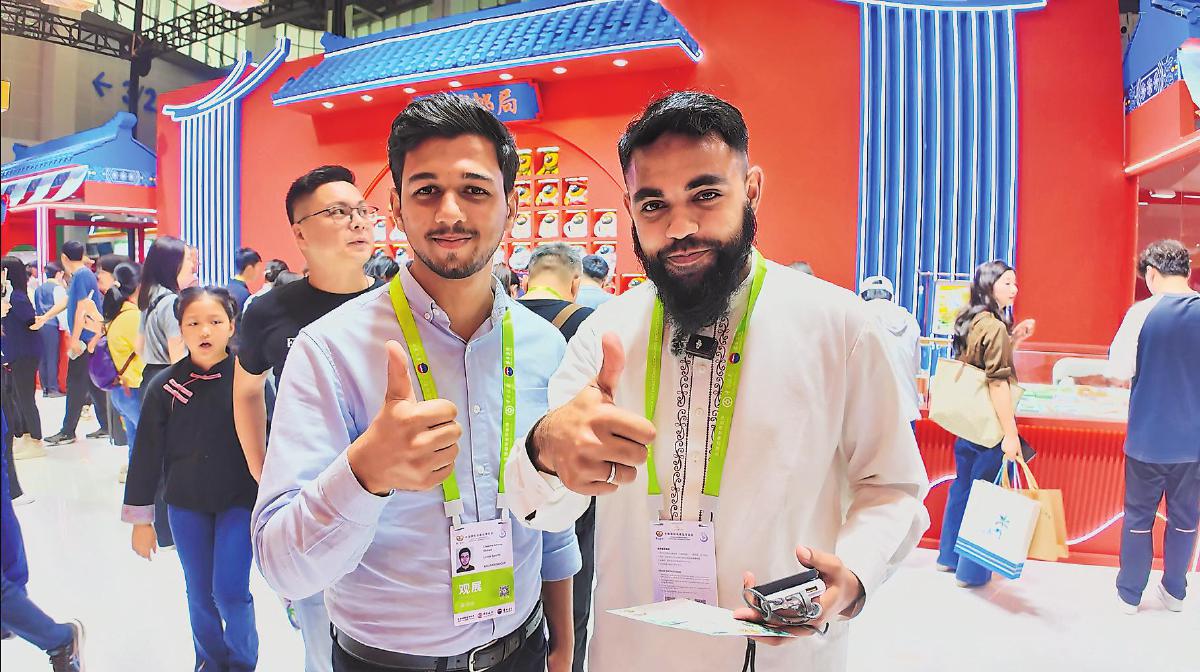 “消博郵局”推出的系列特色活動包括:邀請哪吒、敖丙等國漫IPcoser互動表演,海南漫畫家唐杰提供Q版自畫像定制服務(wù),提供10款紀(jì)念戳供觀眾蓋戳打卡,辦理郵儲銀行信用卡贈露營車和“消博無憂寄”特惠券,滿額贈“黃金銀票”兌換禮品等,為參與者帶來沉浸式的文化體驗。圖為來自巴基斯坦的兩位觀展商為蓋戳打卡活動點贊。