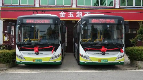 兩輛“客貨郵”公交掛著紅綢等待發(fā)車。