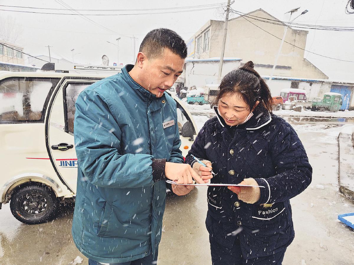 風(fēng)雪中,劉雷鋒為客戶投遞急需的證件。
