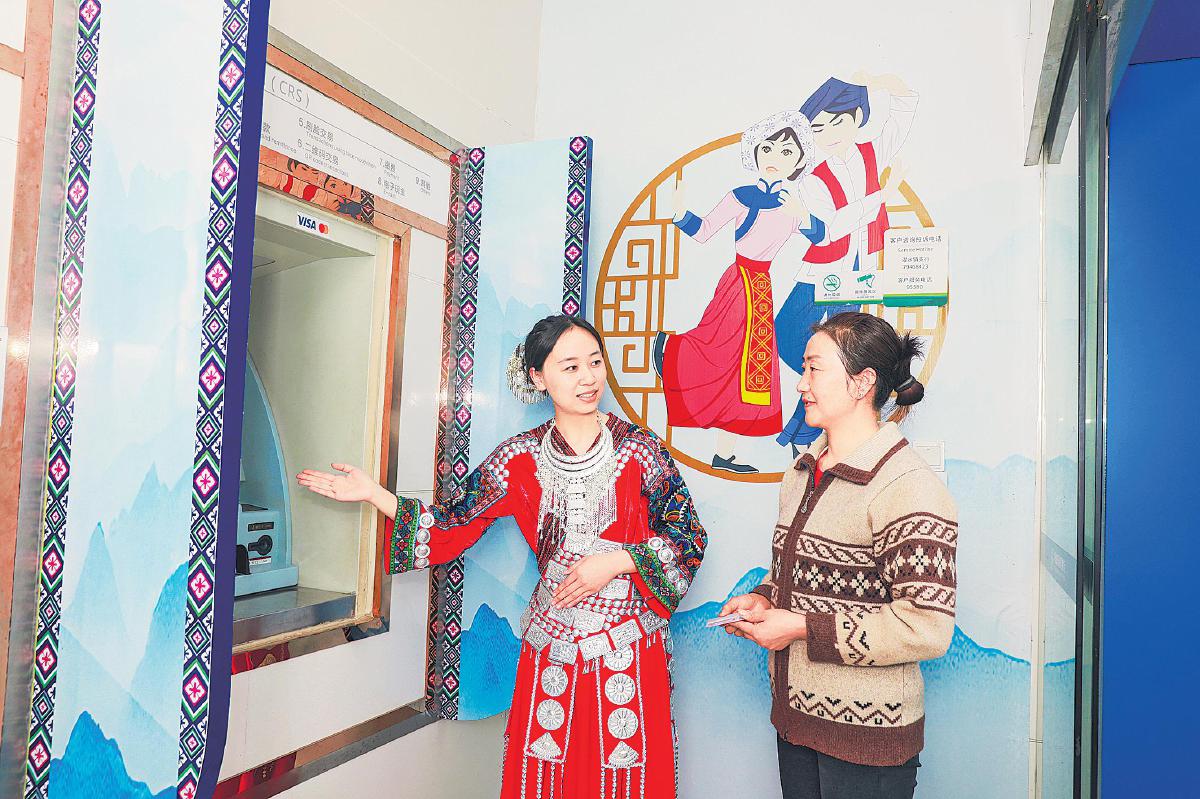 濯水鎮(zhèn)支行員工身著土家族傳統(tǒng)服飾為客戶服務(wù)。