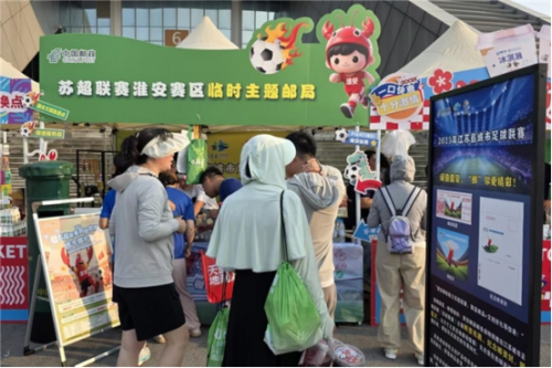 鎖定主場,延伸服務半徑。淮安郵政充分發(fā)揮主場優(yōu)勢,成功爭取多個現(xiàn)場助威名額,在全市范圍內策劃開展“郵我來助威,一鉗定勝負”系列主題活動。在郵政網點設立“蘇超助威區(qū)”,為市民提供賽事直播觀看、文創(chuàng)產品領取等沉浸式互動體驗,有效延伸了服務觸角。