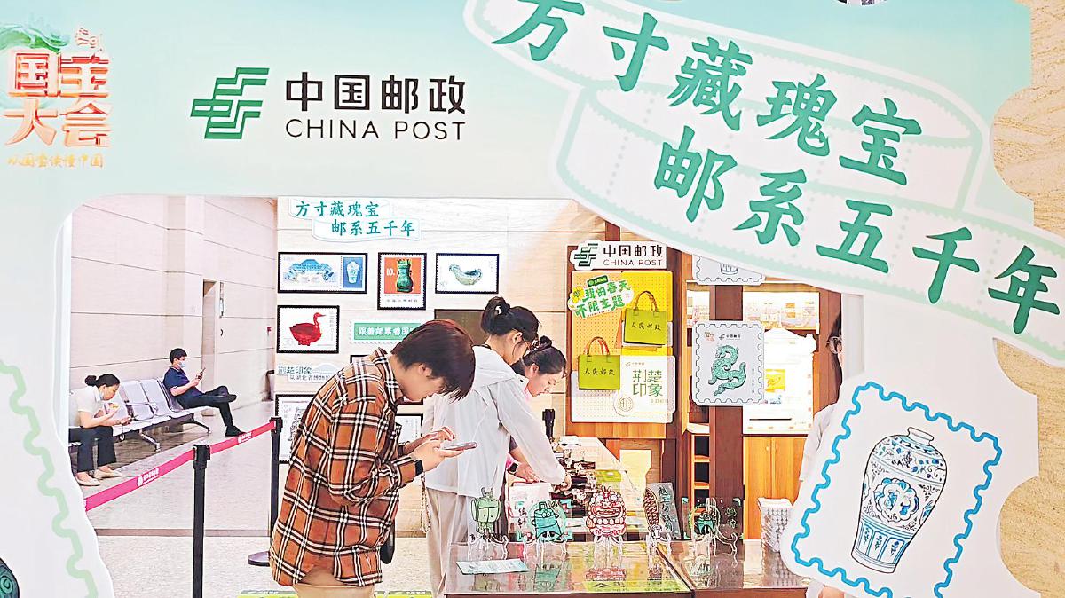 在荊楚印象主題郵局,“十大鎮(zhèn)館之寶”紀(jì)念圖章、《遇鑒·千年記憶》定制專(zhuān)屬郵票冊(cè)、定制極限片、壓印明信片等30余款結(jié)合湖北省博物館館藏文物元素開(kāi)發(fā)的郵政文創(chuàng)產(chǎn)品備受游客喜愛(ài)。