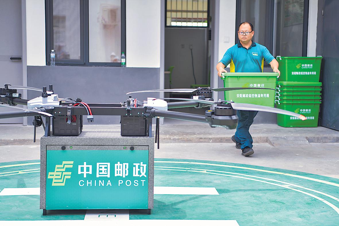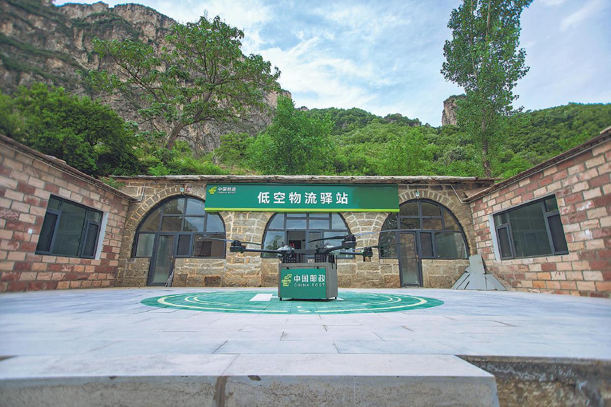 6月17日,在河南省林州市石板巖鎮郵政支局,伴隨著螺旋槳的嗡鳴聲,一架載重50公斤的無人機從停機坪騰空而起,載著郵件飛向海拔1300米的上坪村。7分鐘后,隨著無人機在上坪村的郵政低空物流驛站穩穩降落,河南首條無人機山區郵路正式投入常態化運營。