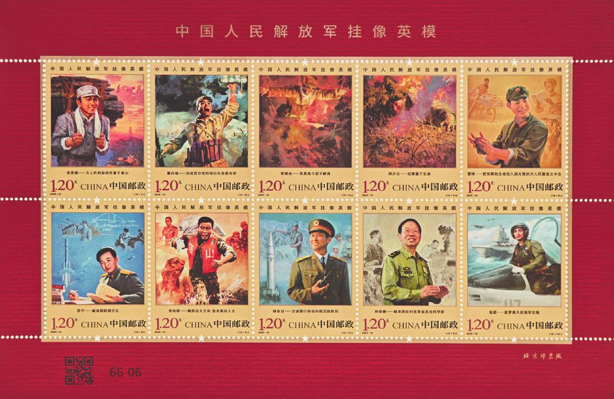 8月1日,《中國人民解放軍掛像英模》紀念郵票發(fā)行。該套郵票一套10枚,展現(xiàn)的英模人物分別是:張思德——為人民利益而死重于泰山,董存瑞——完成黨交給的艱巨任務最光榮,黃繼光——英勇戰(zhàn)斗奮不顧身,邱少云——紀律重于生命,雷鋒——把有限的生命投入到無限的為人民服務之中去,蘇寧——獻身國防現(xiàn)代化,李向群——胸懷遠大志向追求高尚人生,楊業(yè)功——忠誠履行使命的模范指揮員,林俊德——獻身國防科技事業(yè)杰出科學家,張超——逐夢海天的強軍先鋒。
