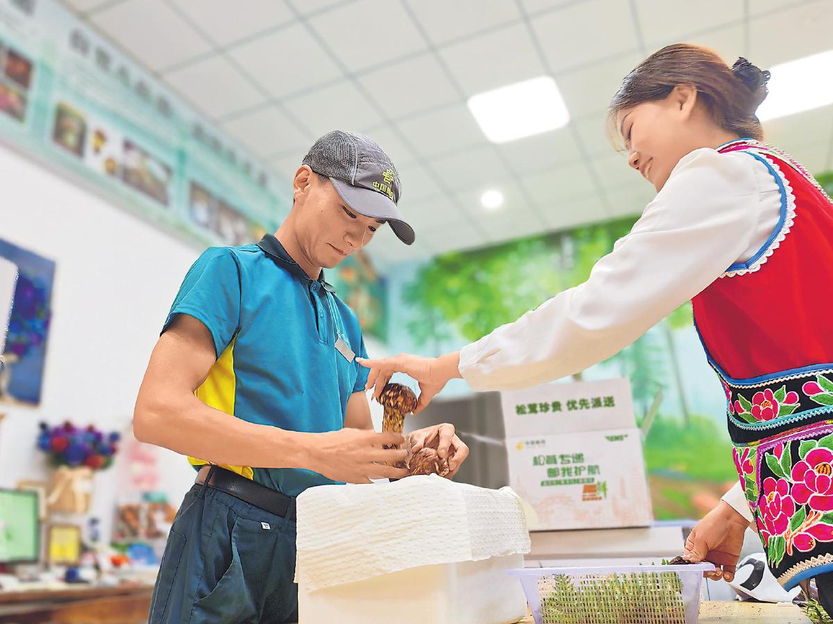 郵政員工在交易中心為游客辦理松茸寄遞。