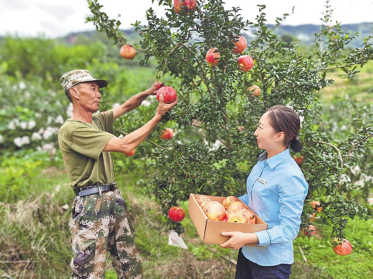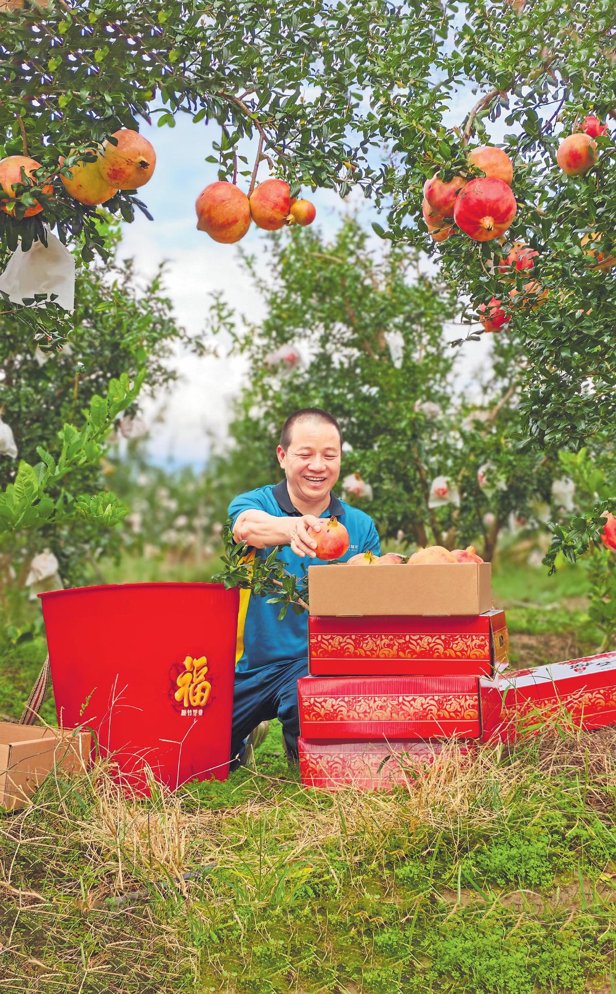 采摘下來(lái)的石榴經(jīng)人工分揀、剔除瑕疵后裝入郵政標(biāo)準(zhǔn)箱。