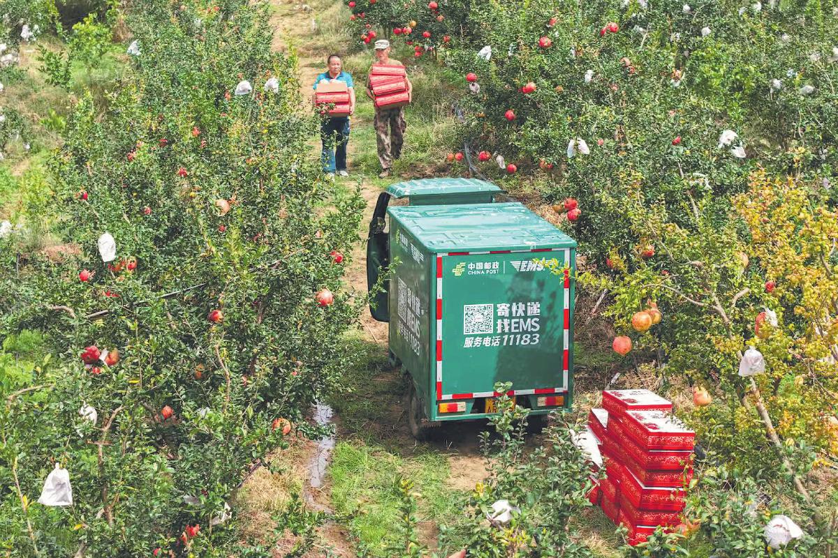 郵政員工與果農(nóng)一起歸集石榴,準(zhǔn)備批量裝車(chē)。