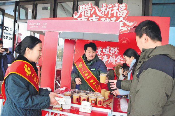 1月26日,江蘇省射陽縣郵政分公司聯(lián)合共建單位——中聯(lián)社區(qū)、吾悅廣場(chǎng)置業(yè)公司,在吾悅廣場(chǎng)開展“臘八祈福,事事粥全”活動(dòng),免費(fèi)向快遞小哥、出租車駕駛員、環(huán)衛(wèi)工作者等500多名群眾送上可口的臘八粥和面巾紙,并向他們送上節(jié)日祝福,讓節(jié)日的溫暖在街頭巷尾流淌。