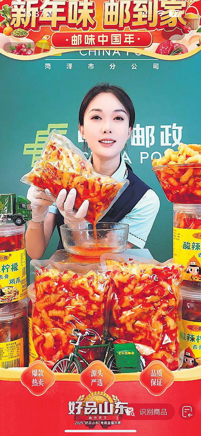 “‘年貨節(jié)’福利來了!無骨雞爪酸辣開胃,佤味雞爪麻辣鮮香,為春節(jié)家宴增添美味!”在菏澤郵政“年貨節(jié)”主題直播間,主播的熱情推薦迅速激發(fā)消費意愿,讓這場精心籌備的年貨直播一炮而紅。