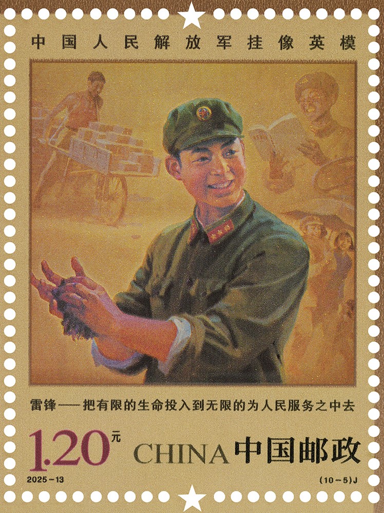 中國郵政定于2025年8月1日發行《中國人民解放軍掛像英模》紀念郵票1套10枚,郵票圖案名稱為:張思德、董存瑞、黃繼光、邱少云、雷鋒、蘇寧、李向群、楊業功、林俊德、張超。全套郵票面值12元,計劃發行數量450萬套。